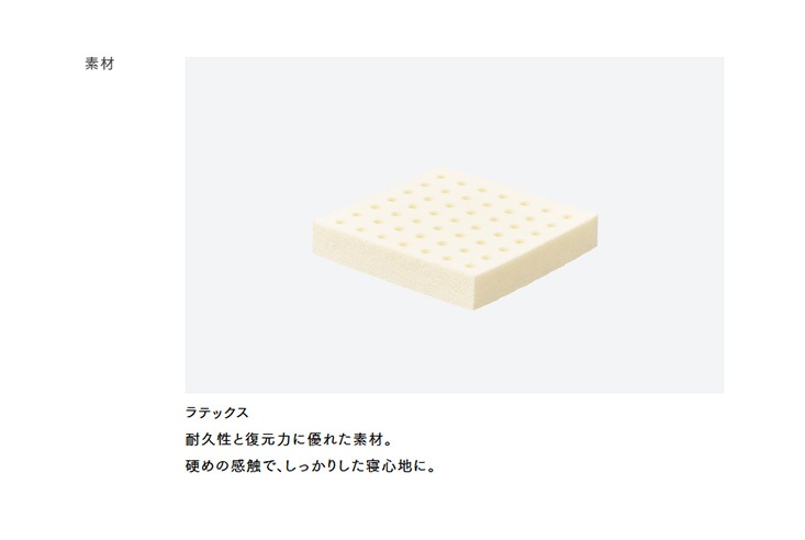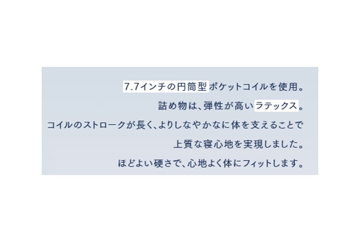7.7インチの円筒型ポケットコイルを使用。詰め物は、弾性が高いラテックス。コイルのストロークが長く、よりしなやかなに体を支えることで上質な寝心地を実現しました。ほどよい硬さで、心地よく体にフィットします。