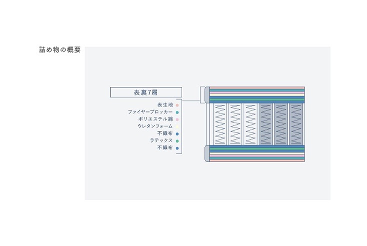 コイル: 形状:円筒形 高さ:7.7インチ 線径:1.3mm(1.5mm) コイル配列:交互配列 ゾーニング:5ゾーン超高集積 詰め物: 形状:ノーマル 厚さ:31cm 層数:表7層、裏7層 |