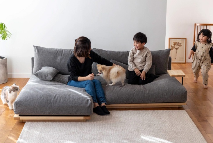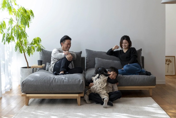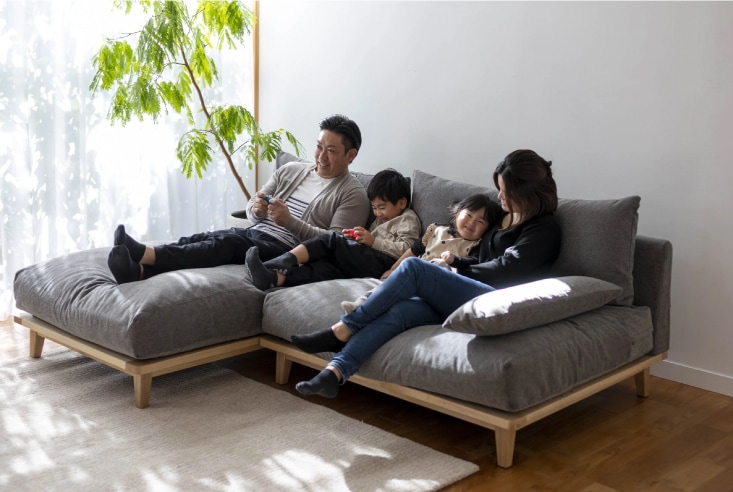 座ったら動きたく無くなるような心地良い至福の座り心地のソファ。自然と家族の集まる場所になり、幸せの時間を過ごしていただきたいという想いでこの名前が名づけられました。ライフスタイルに合わせて組み合わせを変えたり、お好みに応じてロータイプソファとしても使用でき、多様に活躍するソファです。
