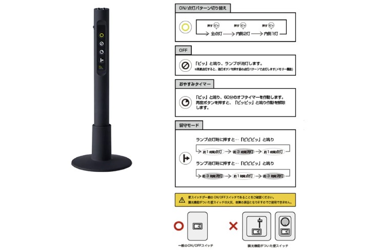 | 備考 | ※調光機能付きの壁面スイッチがあるお部屋では、調光機能を使用しなくても故障の原因となりますのでご使用にならないでください。 ※傾斜天井への取り付けはできません。天井に対して垂直にご使用いただく仕様となっております。傾斜のある天井や、傾斜を合わせた船底天井にお使いいただくと故障の原因になります。 |