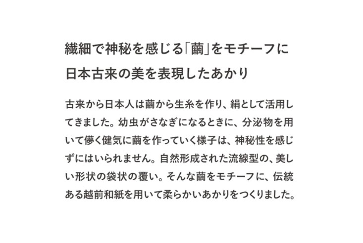 伝統工芸とモダンデザインの融合。古来から日本人は繭から生糸をつくり、絹として活用してきました。幼虫がさなぎになるときに分泌液を用いてつくる袋状の覆いは、自然形成された流線形の美しい形状です。そんな繭をモチーフに、伝統ある越前和紙を用いてやわらかな灯りをつくりました。LED ミニ球(クリア) 推奨。
