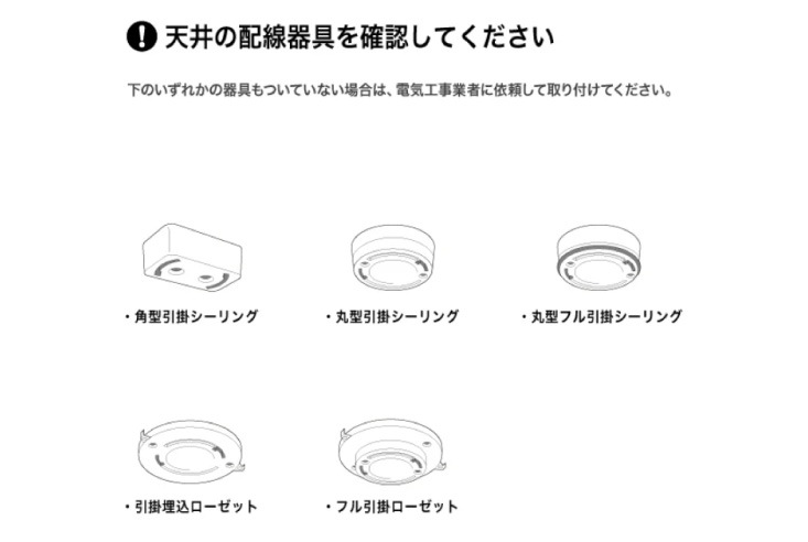 | 備考 | ※ シェードは取り外せません。 ※LED電球は内蔵型のため取り外し、交換はできません。 ※壁スイッチに調光システムが備わっている場合は、点灯不良や故障の原因となりますので、ご使用いただけません。 ※器具落下や故障の原因になりますので、傾斜のある天井や傾斜を合わせた舟底天井には絶対に取り付けないでください(必ず平らな天井に取り付けてください)。 |