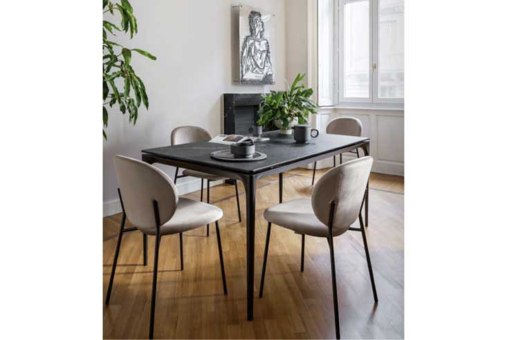 座面はファブリック、脚部はメタルや木材など異なる仕上げが可能で、個々のインテリアに合わせたカスタマイズがしやすいダイニングチェアです。