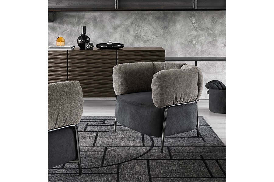 クアドロッタ(Quadrotta)チェアは、ソフトな背もたれと背が高くボリュームのある座面が特徴的なチェアです。ボリューム感のあるシートとカーブに沿ったスマートな金属製の脚部を組み合わせたデザインが、高級感とスタイリッシュさを兼ね備え、洗練されたバランスを生み出しています。