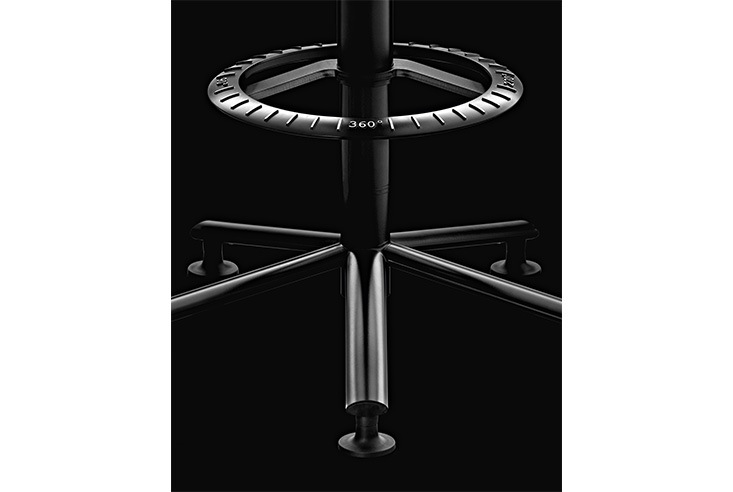 360°という名前の通り、座り方に制約がなく、座ったまま好きな方向へ移動が可能。フットレストには度数が刻まれており、デザインアクセントになっている。シートと背もたれは、クッション性のある素材を使用しており、座り心地も◎。