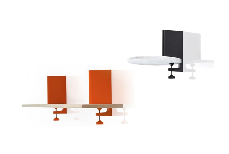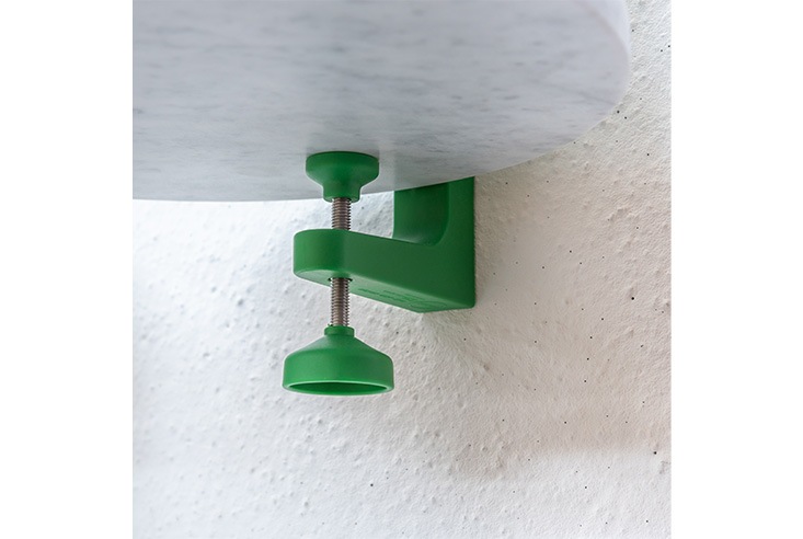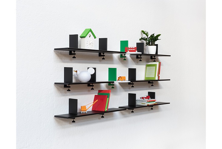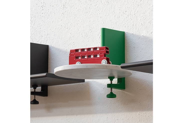 シリーズ展開を広げるコンスタンチン・グルチッチによるコレクション”The Wild Bunch”の壁付け型シェルフ《Spike》。G型クランプの構造をそのままデザインに活かしたこのシェルフは、木と石、スチールの素材から選ぶ事のできる棚板をクランプに挟み込んで使用する、フレキシブルな壁付けシェルフです。
