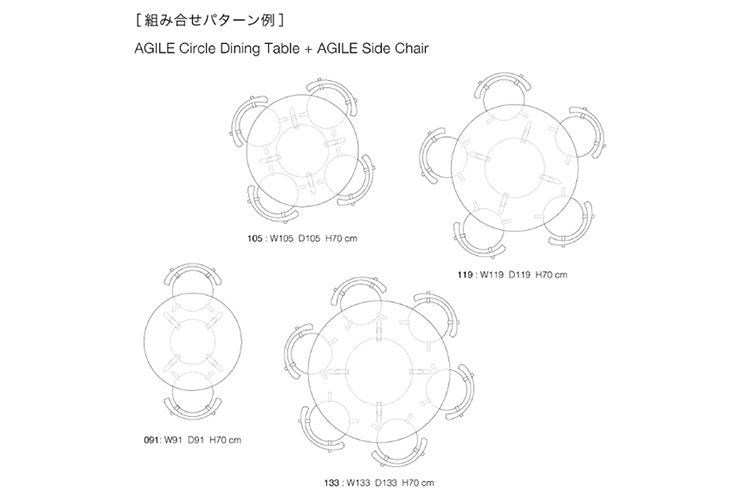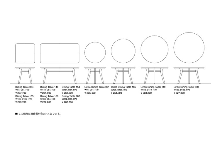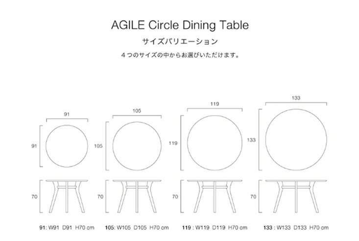 Circle Dining Table 091:幅910奥行910高さ700 Circle Dining Table 105:幅1050奥行1050高さ700 Circle Dining Table 119:幅1190奥行1190高さ700 Circle Dining Table 133:幅1330奥行1330高さ700 |