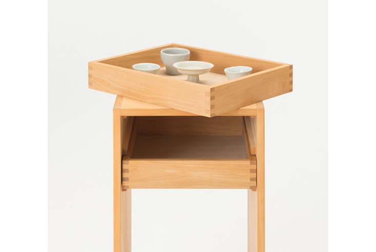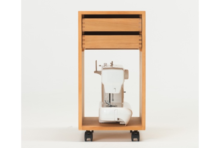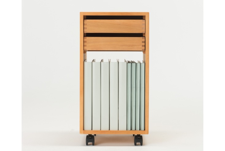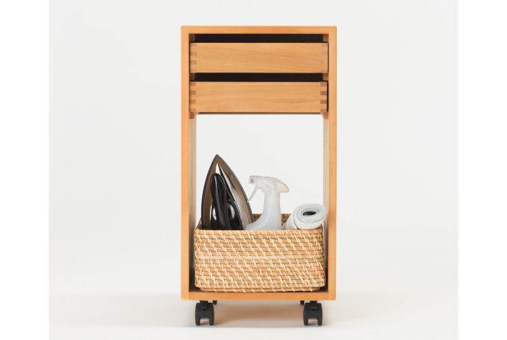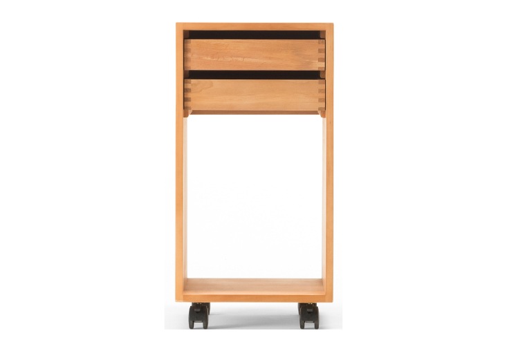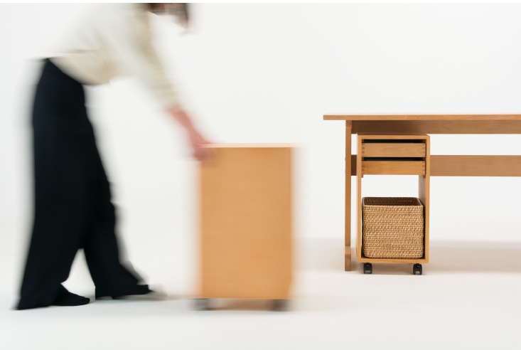 引き出しはトレー式で、下段はオープンタイプ。この特徴的なデザインは、デスクシーンのみならず、テーブルとの組み合わせも考えて生まれたデザイン。自由度が高く、発想次第で様々な使い方が可能です。また、天板の裏側にある手がかりの溝がワゴンの移動をサポート。さらに、フレーム全てを無垢材で製作することで、移動の際の安定性と耐久性を高めました。