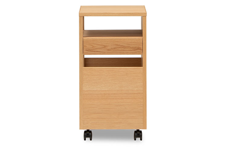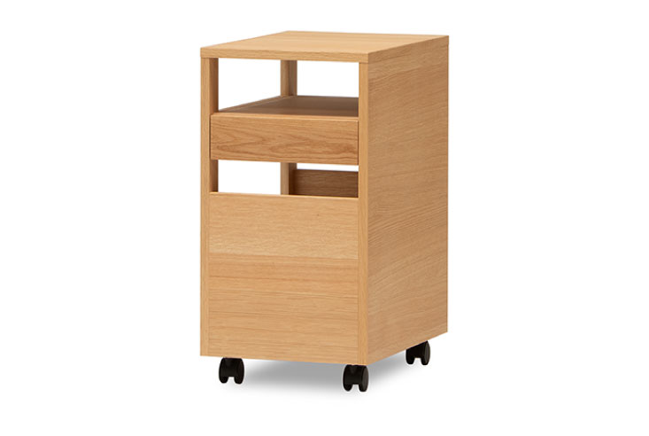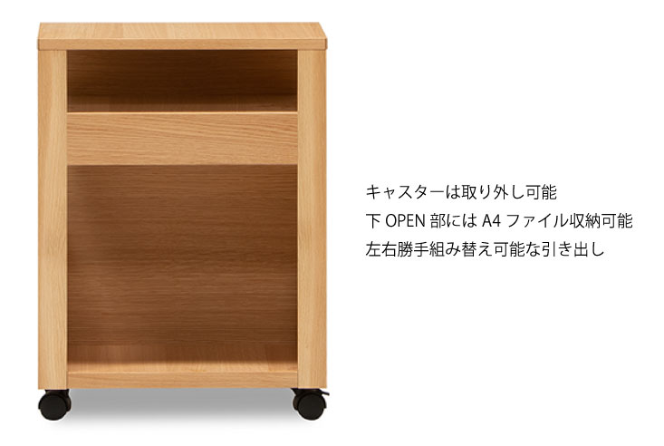 引出しの入替だけで、左右どちら置きもできるワゴン。A4ファイルが入る下部OPEN収納は、ファイルなどが取り出しやすい。キャスターは取り外し可能で、単体使いにも活躍しそうなワゴンです。