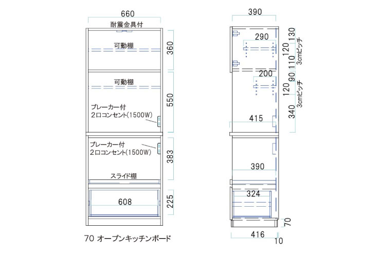 上下オープン部分には、2口コンセント付。扉内は印象的なインディゴブルーで食器を美しく見せてくれます。扉上部には、安心の耐震金物がついています。