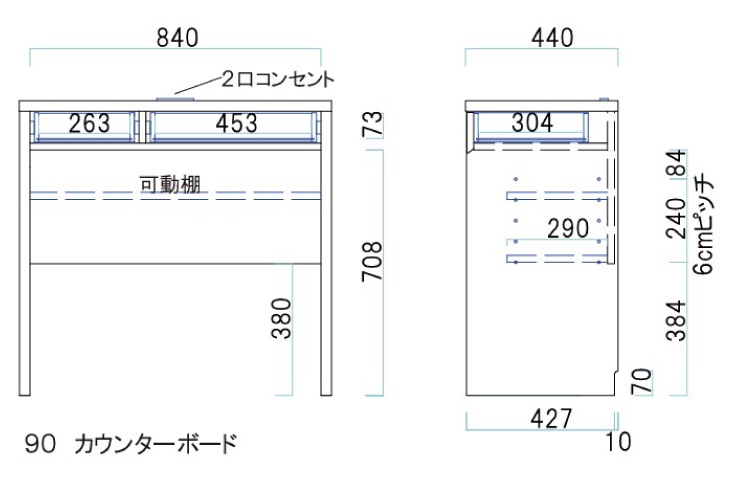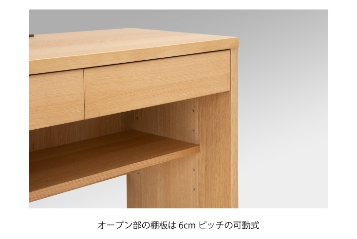 置き場所に困るゴミ箱スペースの確保や、ちょっとした作業スペースに便利なカウンターボード。天板にはコンセントもあるので家電置きとしても活躍します。下部オープン部には可動式の棚がついているので、シェルフとしての機能も果たしてくれます。