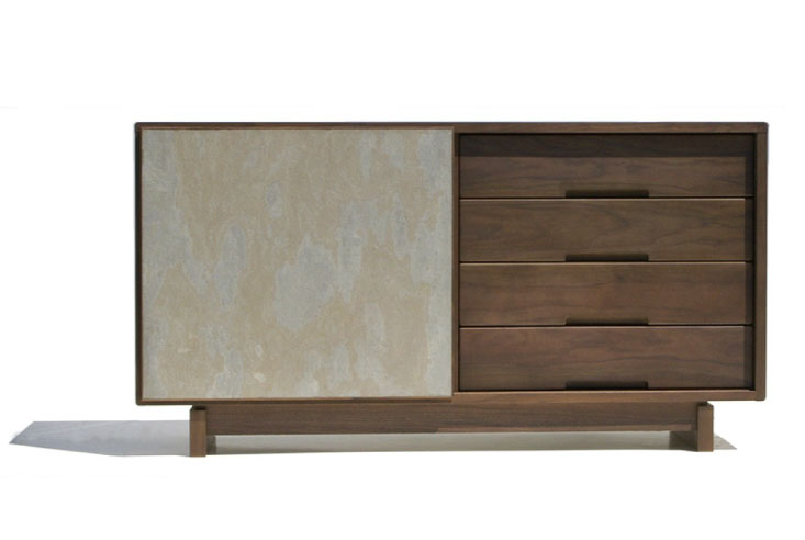 ウォールナットの深い色味と、長い年月をかけてできた天然石の模様が重厚で高級感あるリビングボード。ちょっと低めで薄型サイズは圧迫感なく、置物やテレビを置くだけじゃなく、壁面には絵画などを飾り、ギャラリーのような空間を演出します。