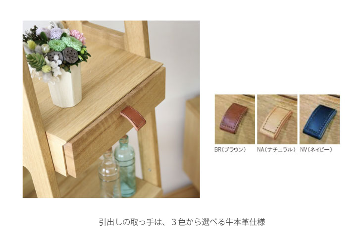 シリーズの特徴である革の引き手はインテリアに合わせて付け替えが可能です。NV(ネイビー)、BR(ブラウン)、NA(ナチュラル)の3色からお好みのものをお選びください。