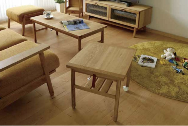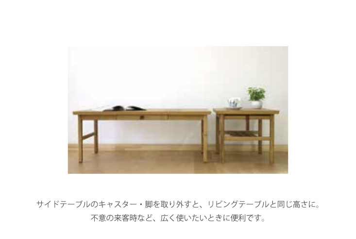 お客様がたくさん集まるリビングでは、キャスターと脚を外してサブテーブルとしても大活躍。簡単でシンプルだからこそ、使い勝手の良さが光ります。