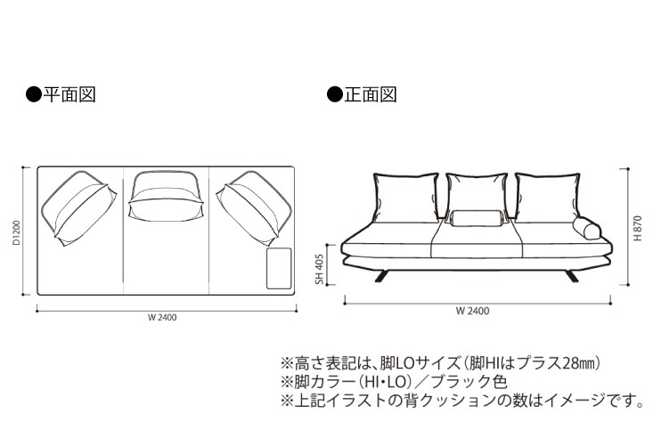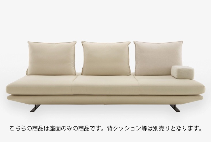 新しくソファをデザインする時は、形を重視し、新しいアクセントを付け加えるのが通常です。しかしROSETPRADOの場合、人の生活や行動の研究から始め、新しいライフスタイルを提案することをコンセプトにしたデザインになっています。背クッションと本体(座面)はセパレートになっており、背クッションは底面に滑り止めがついているため、座面に置いても床に置いても、背もたれとして使用することができます。本体(座面)はシングルサイズのベッドとしても使用可能。背クッションは1つでも2つでも自由に配置でき、背クッションの置き方によってソファにもカウチにもなります。 脚はLO=ロータイプ(H85mm)、HI=ハイタイプ(H113mm)から選べます。ご注文時にご指定下さい。価格はハイタイプにされる場合は18,700円(税込)アップします。本革の背クッションの後面にはもたれた時に中の空気が抜ける小さな穴を開けています。
