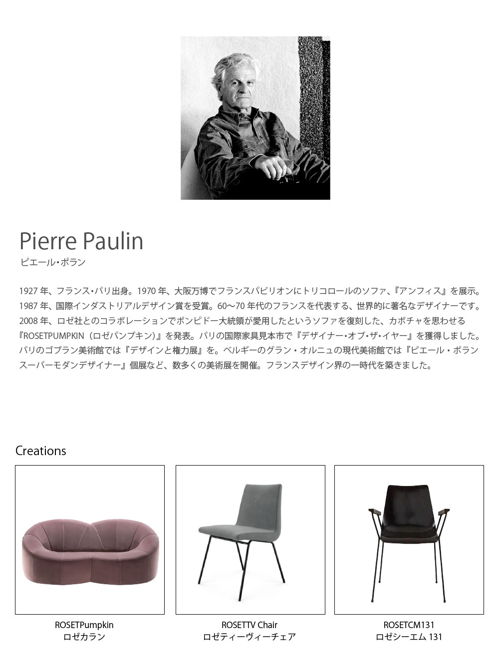 Pierre Paulin / ピエール・ポランは1927年、フランス・パリ出身。1970年、大阪万博でフランスパビリオンにトリコロールのソファ、『アンフィス』を展示。1987年、国際インダストリアルデザイン賞を受賞。60〜70年代のフランスを代表する、世界的に著名なデザイナーです。