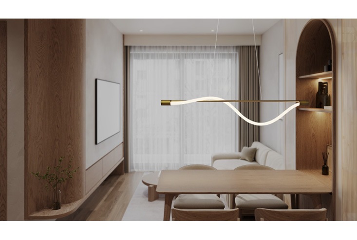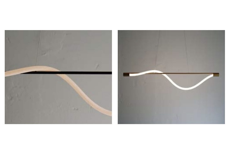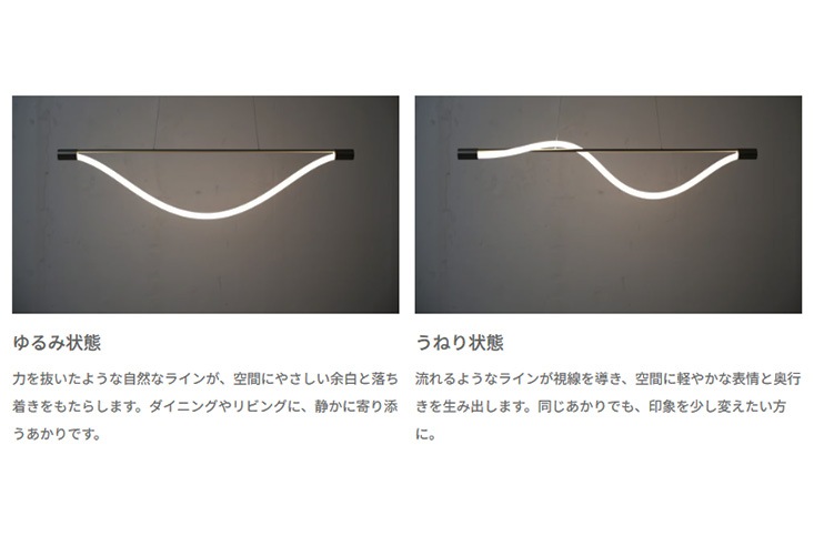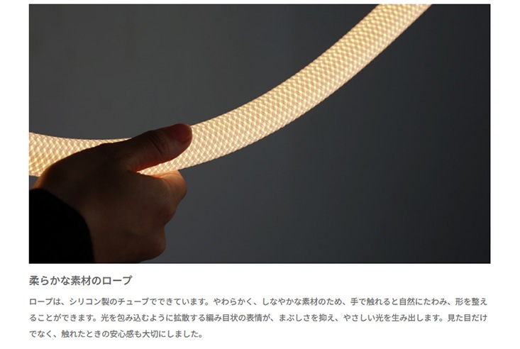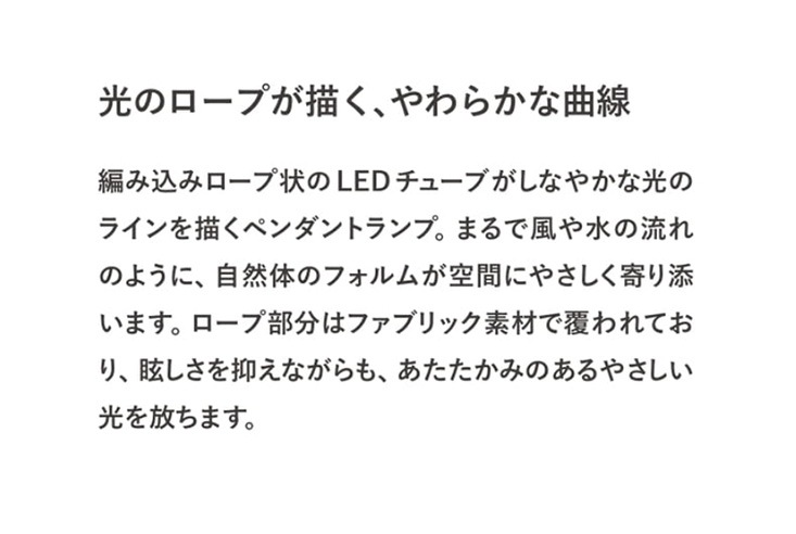 編み込みロープ状のLEDチューブがしなやかな光のラインを描くペンダントランプ。まるで風や水の流れのように、自然体のフォルムが空間にやさしく寄り添います。ロープ部分はファブリック素材で覆われており、眩しさを抑えながらも、あたたかみのあるやさしい光を放ちます。