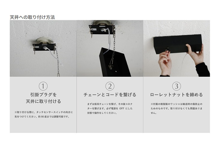 引掛シーリング式 ワイヤーコード吊り タッチセンサースイッチ式 電球交換不可 無段階調光 調光メモリー機能付き 組立式 |