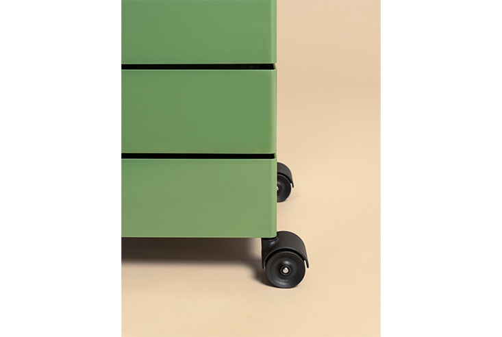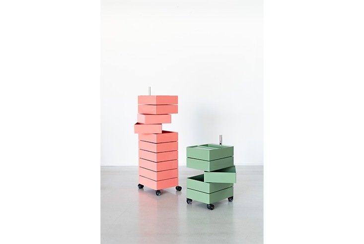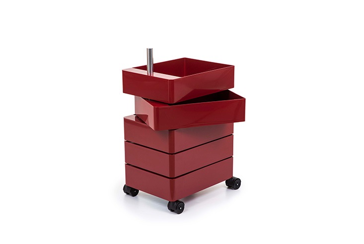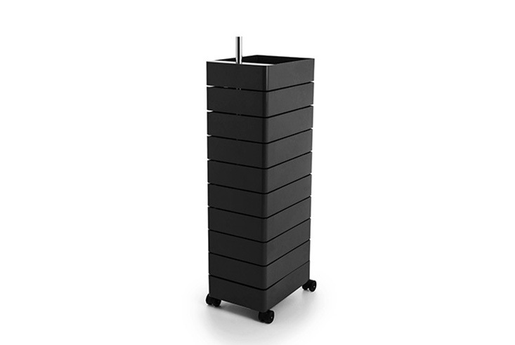 「360°コンテナ」は、同じ形(内寸42 x 32 x 9.5 センチ)の収納トレーが縦に並んだワゴン。各トレーは、支柱を中心に360度に回転するので、どの方向からも荷物が取り出しやすく、回しても一旦止まるので空けたまま使うこともできます。また、ワゴン底面にキャスターが付いているので、荷物を収納したままの移動も楽々です。