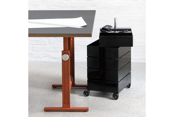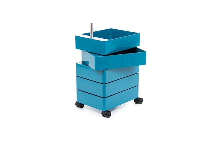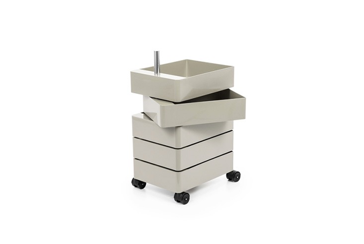 「360°コンテナ」は、同じ形(内寸42 x 32 x 9.5 センチ)の収納トレーが縦に並んだワゴン。各トレーは、支柱を中心に360度に回転するので、どの方向からも荷物が取り出しやすく、回しても一旦止まるので空けたまま使うこともできます。また、ワゴン底面にキャスターが付いているので、荷物を収納したままの移動も楽々です。