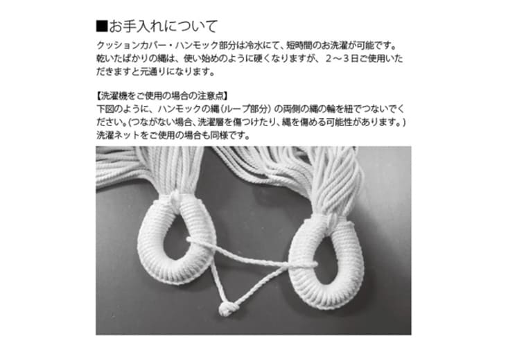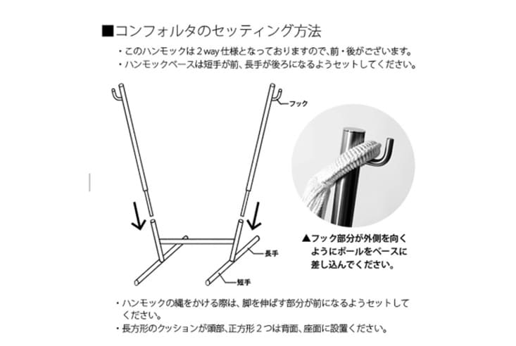 ※コンフォルタに掛ける際は、両手でハンモックの座面を掴み、ハンモックが揺れていないのを確認してからゆっくりと奥の方へ座ってください。