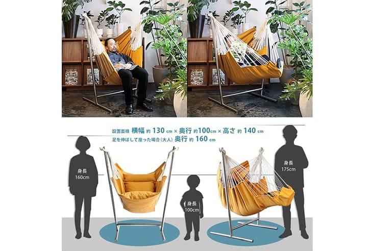 "室内はもちろんアウトドアでも" 室内では1人掛けソファと同程度の面積があれば簡単に設置することができます。 フレームは簡単に3分割でき、ハンモック本体も軽量でコンパクトにたたむ事ができる為、クローゼットに収納する事も、テラスや庭先へ持ち出す事も、 車へ積んでアウトドアへ出かける事もできます。 耐荷重は約100kg、耐久性能も高くデザイン性、品質にも優れた他に類を見ないハンモックチェアです。 屋内および屋外でのご使用可能。(防水仕様ではありませんので、屋外でご使用の場合は水のかからない様にご注意ください。) ※ハンモックの座面のポジションについて、しばらく使っていくうちに馴染んで少し下のほうに、伸びる感じになります。 |