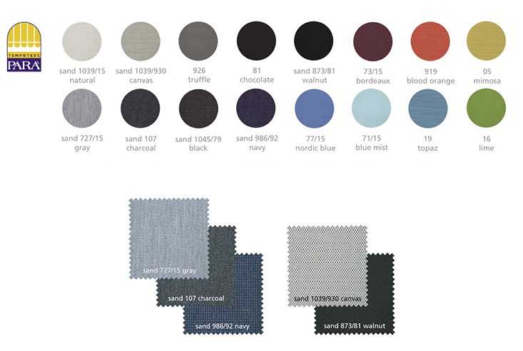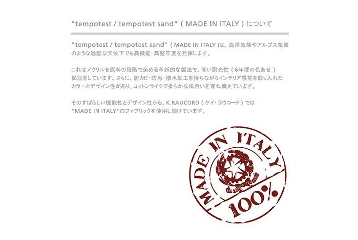 別売クッションは、Fabric ”tempotest” from Italy を使用しており、色あせに強く、防カビ・防腐・防汚・エクストリーム撥水加工を施し、野外でご使用頂けます。万一汚れても手洗いすることができ、清潔に保てます。