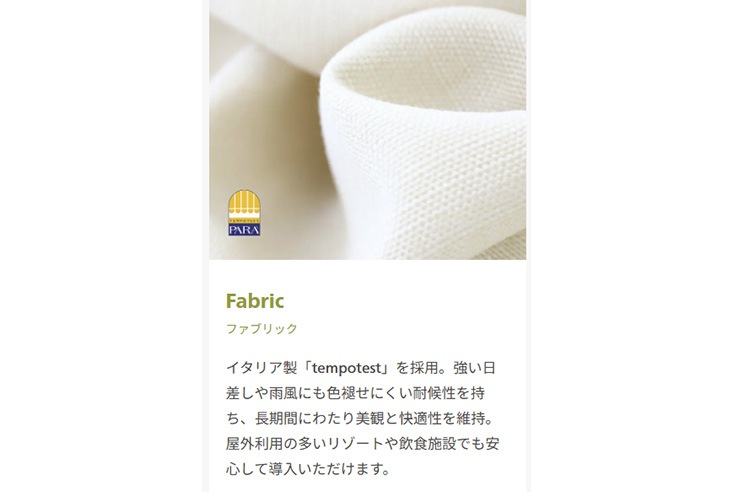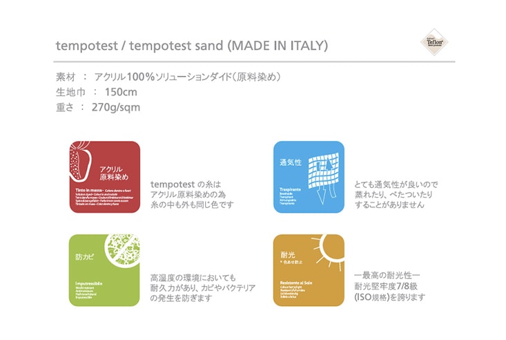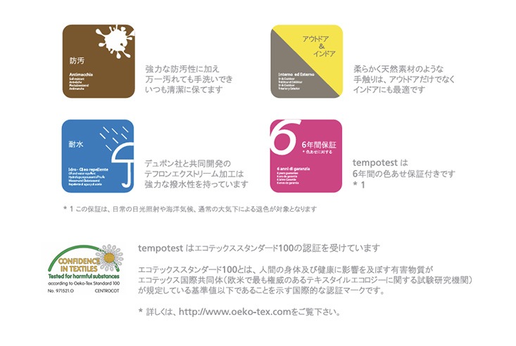 別売クッションは、Fabric ”tempotest” from Italy を使用しており、色あせに強く、防カビ・防腐・防汚・エクストリーム撥水加工を施し、野外でご使用頂けます。万一汚れても手洗いすることができ、清潔に保てます。