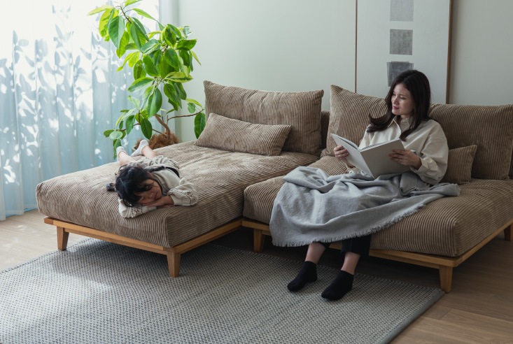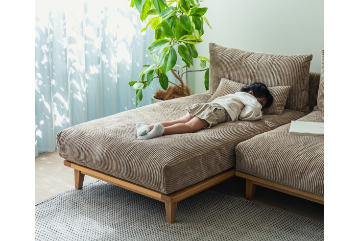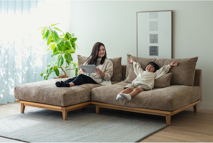大人気の「幸せになるソファ」、新たにコーデュロイ生地が追加されました。カラーはベージュ、グレー、グリーンの3色。コーデュロイは夏はサラリとした感触で手触りがよく、冷房の冷たい空気を保温し、冬はあたたかな高級毛布の心地よい肌触りで、高い保温性によりあたたかな感触の生地となります。