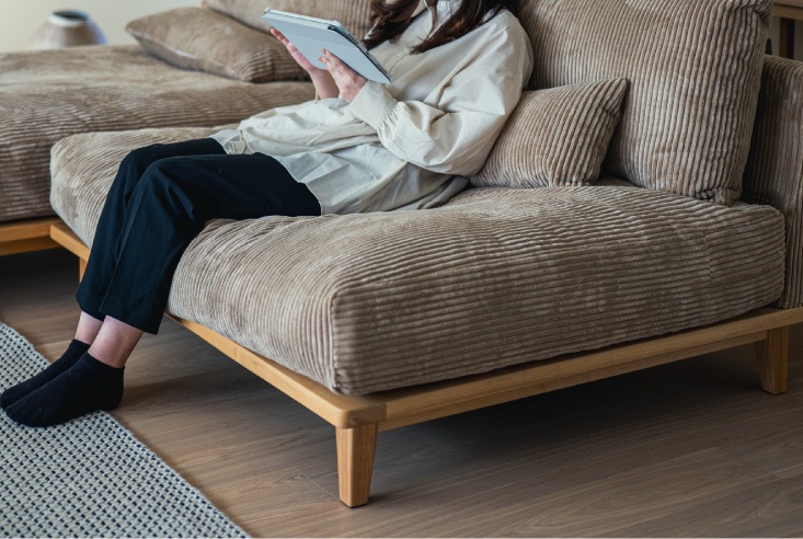 ポリエステル生地のコーデュロイは、汗や湿度による異臭、カビが発生しにくく、太陽光による変色の少ない生地です。洗濯ネットを使用すればご家庭でお洗濯できる点も、お手入れがしやすいソファです。