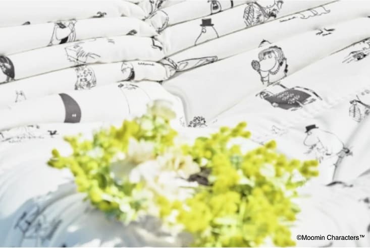 人気キャラクター「ムーミン」と、フランス発祥の「リーン・ロゼ」がコラボレーションしました。生地に描かれているのは、これまで商品で使用されることはほぼなく、大変貴重なアートになります。今回のコラボレーションに際して、ムーミンキャラクターズ社のクリエイティブディレクターが特別にアートを選定しました。コットンの上質な風合いと心地よい肌触りをお楽しみいただける、日常を彩るファブリックです。